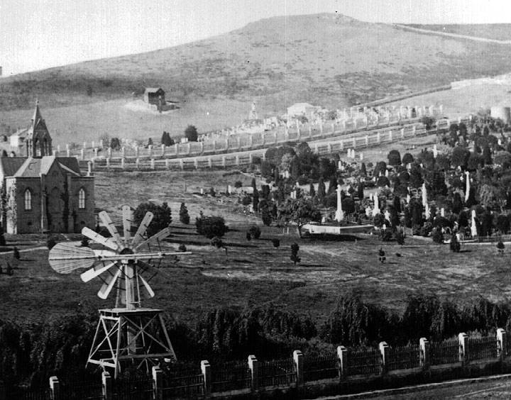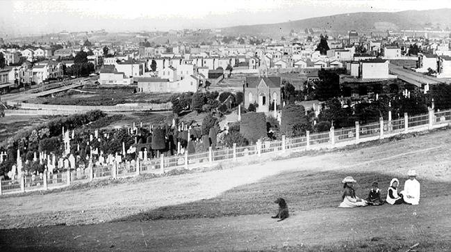 Nearby is the Mission Dolores Cemetery, c.1880, with a view of Liberty Hill looming in the background.