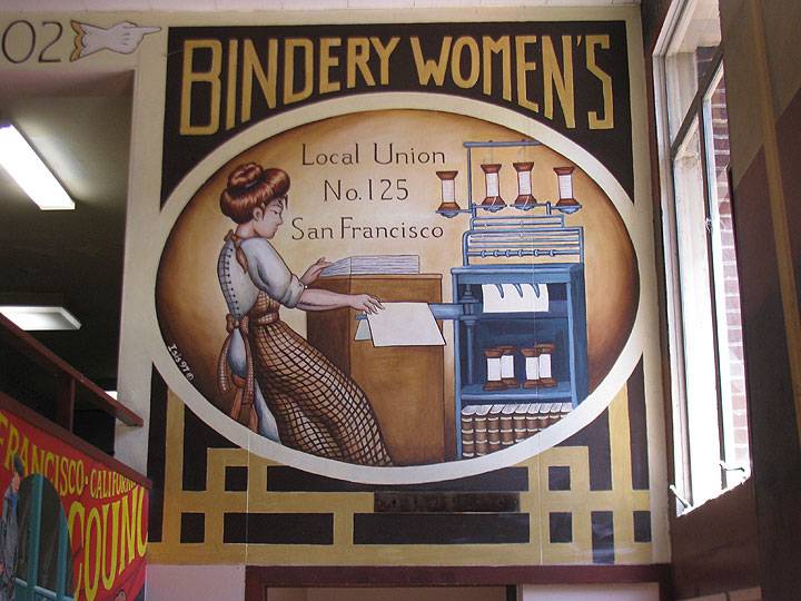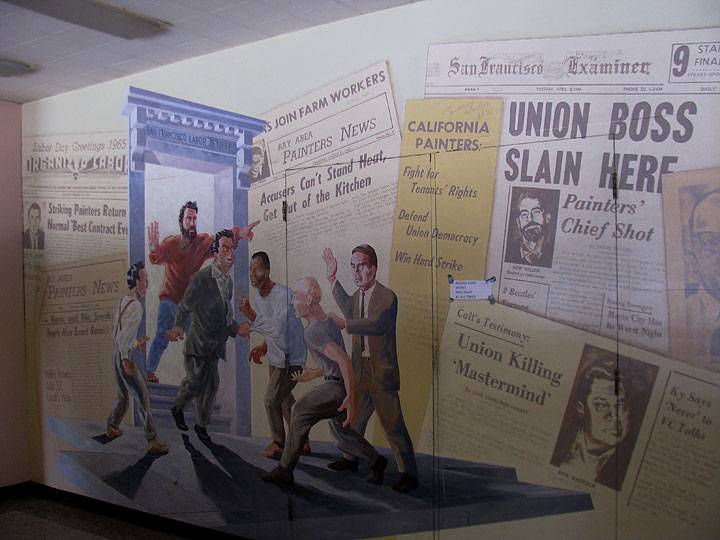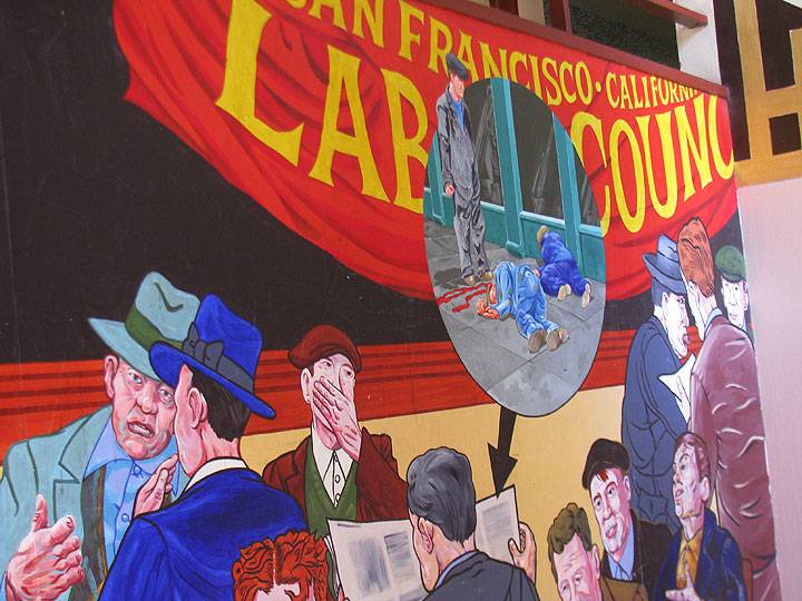Based on six months of historical research about the former San Francisco Labor Temple, headquarters of the Labor Council and home to the Labor Clarion newspaper and numerous locals from 1914 to 1968, this twelve mural project includes six murals on labor themes, including the 1934 general strike, the organization of Chinese garment workers in 1938, the department store strikes of the early forties and the career of Dow Wilson of Painters Local 4, who was assassinated in 1966. This mural was organized by the Clarion Alley Mural Project with a grant from the Creative Work Fund.