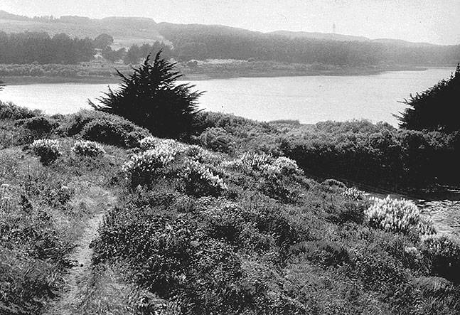 Wildflowers surround Lake Merced, 1920s.