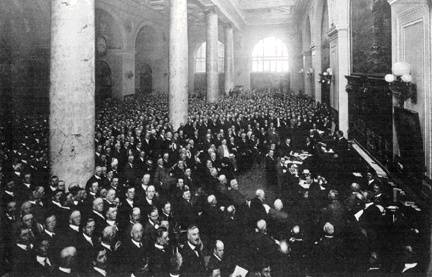 Mass meeting of 2,000 merchants, business and professional men of San Francisco, July 10, 1916, on floor of the Merchants Exchange, leading to the formation of the Law & Order Committee of the SF Chamber of Commerce. Within months the new committee had received over $1 million to pursue its campaign against organized labor.