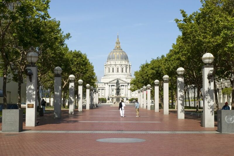 United Nations Plaza is important historically and as an urban landscape design. Beginning his career in the San Francisco Bay region in the late 1940s, Lawrence Halprin was influenced by the Modernist city planning ideas of Walter Gropius and Marcel Breuer and by the idealism of the Works Progress Administration's park and parkway programs (pdf) under President Franklin Delano Roosevelt. Halprin tried to moderate the effects of post-World War II urban abandonment by creating social and pedestrian spaces. In the 1970s, Halprin and his team created a series of public spaces designed to be comfortable for pedestrians along San Francisco’s Market Street, the main commercial thoroughfare and the spine of the city’s rich transit network. The 2.5-acre United Nations Plaza responded to the sad state of Market Street’s distressed mid-section by creating a gateway to the city’s Civic Center, a Beaux-Arts civic icon inspired by the City Beautiful movement at the turn of the 20th century.