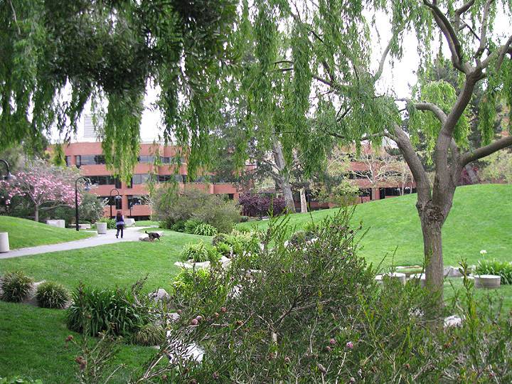 East of Battery Street, the park loses it hard edge and turns soft. Halprin said this area was a homage to the Sierra foothills business beginnings of Levi Strauss. The key features now are soft rolling green hills, pine and willow trees and more water and granite, but they are integrated in a stream that suggests California’s mountain terrain before it takes a whimsical turn toward a Japanese garden complete with bridge.
