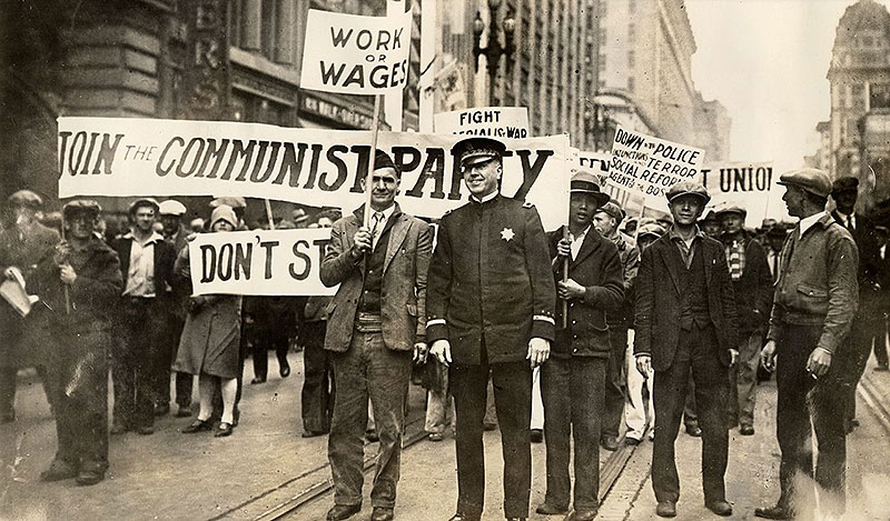 Communist Party parade, 1930s, on Market Street in San Francisco with Police Chief William J. Quinn in middle.