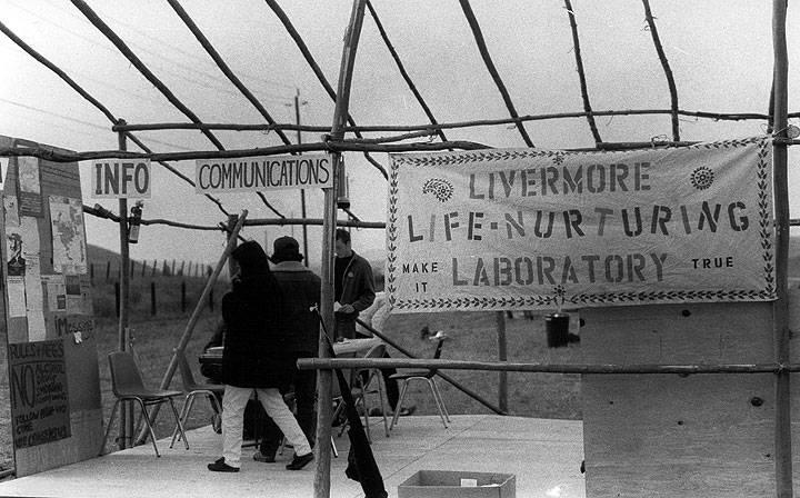 Forgive the romantic beginning. It is Saturday, the first day of construction at the new peace camp in Livermore, nearly sunset. I am walking across the big field on which the encampment is set, alone, performing some small but necessary errand. The dwindling light makes the surrounding hills look flat and velvety, bringing out the sensuality of their contours. The cars hum by on the freeway, headlights sparkling. The air smells good and I suddenly notice I am happy. I trudge along, trying to avoid the holes arid the cow shit, toward the sound of hammering and laughter. A small group of people is putting in the last supports behind the big sign facing the freeway. "Livermore Peace Lab," it says.