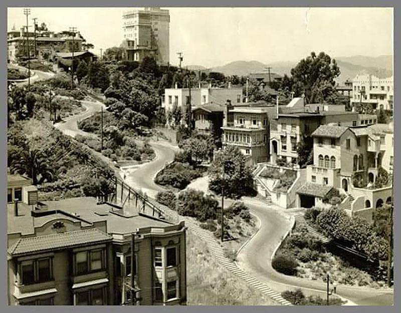 On the east side of Telegraph Hill, a small portion of Lombard Street runs from Montgomery to the Embarcadero. The old Del Monte Milling building dates to 1907, and seen here in this August 1968 view when the area was still largely industrial.
