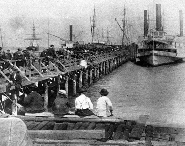 Smelt Fishing from Long Bridge, 1869. The South of Market Journal recalled that Hobbs Wharf, off Long Bridge, “was a great place for Sunday and holiday fishing. If one did not get there at an early hour you hadn’t a chance to drop your line. There were not many fancy fishing outfits seen then, mostly long bamboo poles. . . There were booths along the wharf where you could rent one and buy your bait. Imagine hundreds of these poles projecting out, about a yard apart. The fish caught were smelt—hundreds of these silvery, graceful fighting fish”77