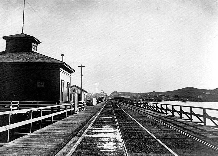 Constructed in anticipation of the expected business boom of the railroad, Long Bridge provided “rapid transit” for workmen from the city to the Potrero and Hunter's Point, formerly reached only by boat or circuitous roads. On Sundays, Long Bridge became the focal point for south-of-Market fun. Smelt fishing from the long causeway was so popular that elbowroom was at a premium. The city’s rowing clubs found the broad, sunny expanse of Mission Bay ideal for races and built their boathouses on pilings next to the bridge. There were boats for rent to row out to Mission Rock, and salt-water bathhouses built right out over the bay.