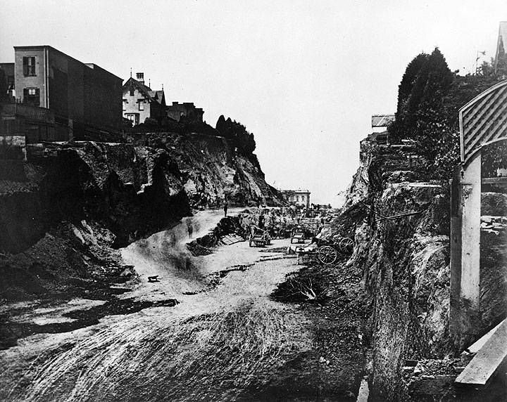 Looking North on Second Street in 1869, cutting the street through Rincon Hill, Second and Bryant Streets.
