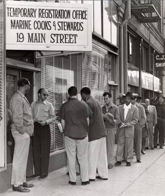 But while the record of the MCS on these “pork chop” issues compares favorably with that of other maritime unions—as statistics on wages and working conditions in the union newspaper never fail to point out—it would be a mistake to assume that only material interests were considered in the black community’s support of MCS and its communists. As one black MCS worker in San Francisco stated: “Sure, the union leaders follow the party line. But I let white folks worry about Communism. Bryson has given us colored guys a fair shake. Why should we want to swap over to an outfit where we’ll be associating with unions that don’t even let Negroes belong?” Black workers did not forget that the “MCS was one of the very few organizations that accepted them fully when they migrated to the West Coast during the war.” In addition to the sense of justice fostered by the MCS emphasis on civil rights and participation, the union played a significant role in the successful resettlements of the black diaspora from the U.S. South—in the very creation of cohesive black communities on the West Coast—not only through employment but also through the development of friendships and solidarity. This dramatic testimony from a black MCS member in Seattle who had migrated from the South sums up a lot:
