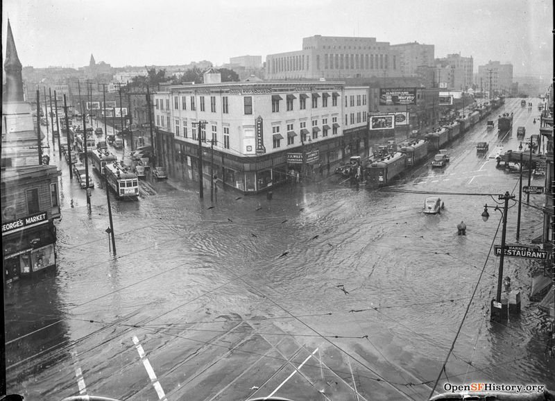 Easterly view on Market at Church, early 1930s. Historic creek re-emerges in heavy rain. The large building in the background was Wiley's Furniture Store. It is now part of the Safeway parking lot.