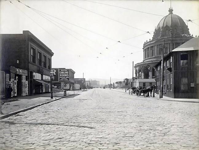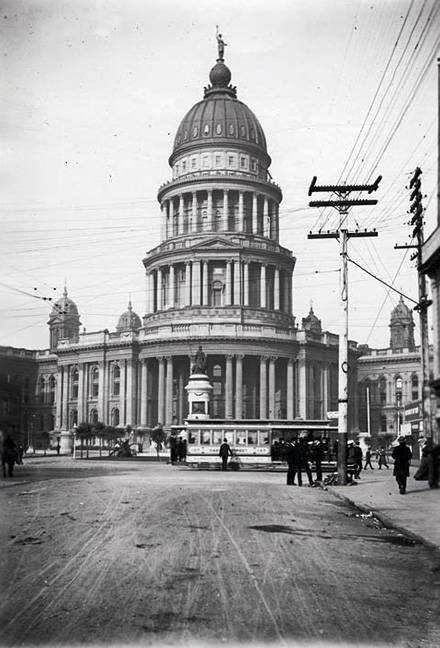 City Hall, circa 1890s. Shot from Eighth Street just below Market, this view looks straight across the Pioneer Monument in the middle of Marshall Square to the old City Hall. Crowning its Baroque dome is the Goddess of Progress, an iron statue with a corona of electric light bulbs.
