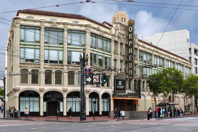 Christened the Pantages when it opened in 1926, the theater was designed as a vaudeville house to replace the original Pantages Theater at 939 Market Street. A few years later, it was sold to RKO and soon thereafter reopened as the Orpheum, a first-run movie house. From the premiere of This Is Cinerama! on Christmas Day 1953 until the final showing of Ice Station Zebra early in 1970, the Orpheum was San Francisco’s foremost Cinerama cinema. The theater was closed for a short time and then reopened in 1977 as a venue for live theater, but the conversion was unsuccessful and the theater was closed once again. It was purchased in 1981 by the Shorenstein Hays Nederlander Organization and since then has been a successful showcase for traveling Broadway shows.