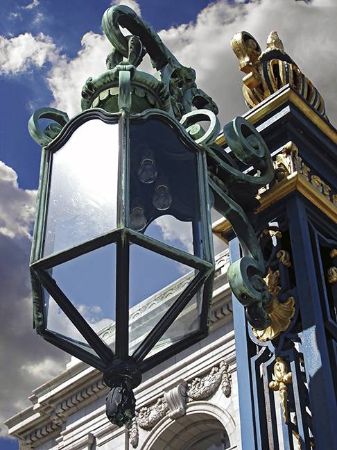 A gated pedestrian walkway — in truth, a tiny park — separates the Opera House and the Veterans Building (partly visible in the background of this photo).