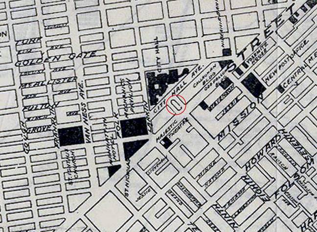 Marshall Square was a plaza that connected Market Street with City Hall Avenue,* a parallel frontage road for the old City Hall. When the old City Hall was destroyed by the 1906 earthquake and fire, the design for a new Civic Center demanded the reshaping of grid lines. City Hall Avenue was completely obliterated and Marshall Square became part of the Hyde Street extension to Market. Opened in 1926, the office building and theater at the corner of Hyde and Market is the namesake of Marshall Square, though anymore it is known only by the name of its theater, the Orpheum.