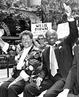 Mayor Brown hails his fans at Gay Freedom Parade in late 1990s.