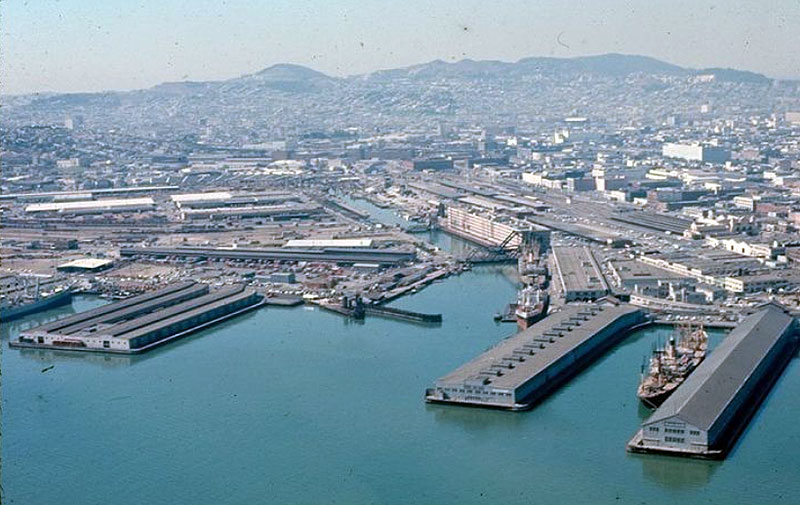 Beyond the Third Street Bridge in both photos hunkers the China Basin Building, built in 1925 by Del Monte Cannery. By 1974, the building had been painted a rich blue. That same year, it was a distribution point of a massive food giveaway conducted by the Hearst family in response to ransom demands of the Symbionese Liberation Army, the kidnappers of newspaper heiress Patty Hearst. Today the building houses corporate offices, and life science and technology firms that value its proximity to UCSF’s new Mission Bay campus. That a ballpark could be built at a site so key to the economic vitality of an earlier San Francisco reminds us of just how outmoded The Port had become by the late 20th century, left in the wake of the container ship.
