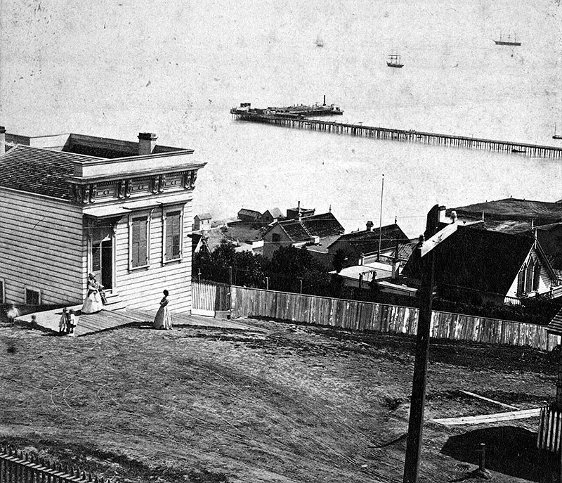 Meiggs Wharf, seen in this photo from the slopes of Telegraph Hill extending northward into the bay sometime between 1865-1875, started from the corner of today's Powell and Francisco Streets, now many blocks from the shoreline.