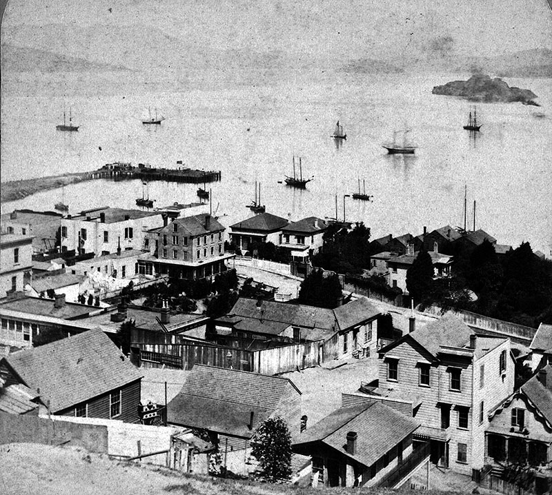 A view in 1870 from Russian Hill showing Meiggs Wharf off the shores of North Beach.