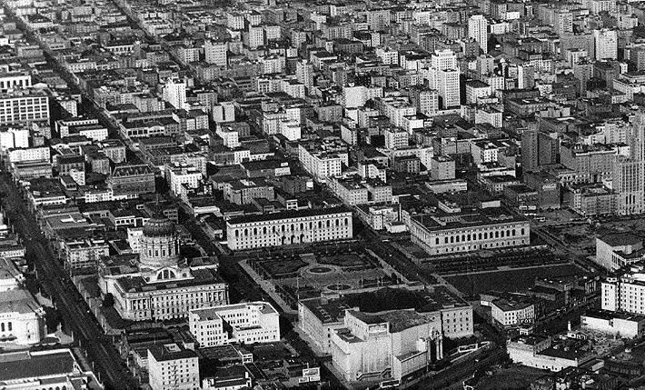Aerial shot of midtown, with Civic Center in foreground, including the Fox Theater at lower center on Market Street.