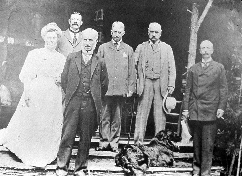 Gilded Era plutocrats: (l to r) Elizabeth Mills Reid, Whitelaw Reid (editor, New York Tribune), Darius Ogden Mills, Elihu Root (Secretary of State for President Theodore Roosevelt, Secretary of War for Roosevelt and William McKinley), J.P. Morgan (banker), and Ogden Mills, at the Mills estate in Millbrae, long before air travel, c. 1900.
