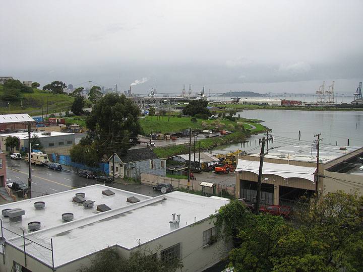 2010 view from top window of Albion Castle northwards across India Basin towards downtown. Small blue building at center left is the Shipwright's Cottage, a San Francisco historical landmark.