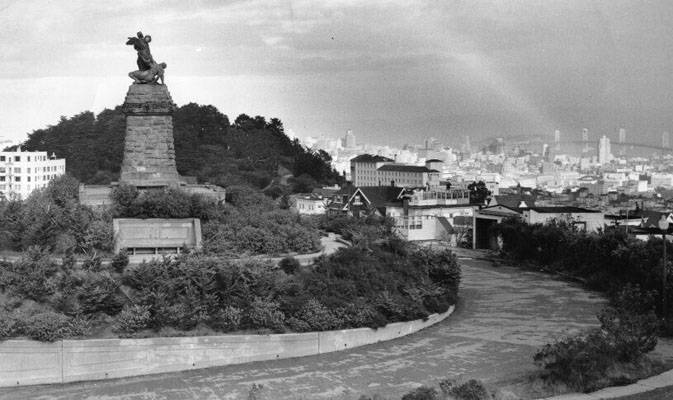 On a beautiful day in 1887, a large group of people gathered at a San Francisco intersection which no longer exists. At 16th and Ashbury, on the top of a hill known as Mt. Olympus, you would find the San Francisco Board of Supervisors, a band, the entire student body from the Sanchez Street School, and dozens of other onlookers. They came to witness the dedication of a huge statue called Triumph of Light that Adolph Sutro had donated to the City. Sutro, an eccentric millionaire entrepreneur and owner of roughly one twelfth of the land in San Francisco (most of it in the Richmond and the Sunset), was giving a mercifully short speech. He praised the view this public statue would command from Mt. Olympus: Marin and Vallejo in the distance; the roofs of the Mission up close.