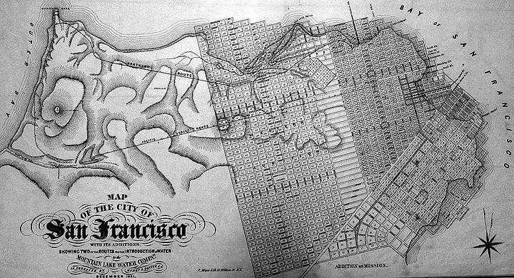 Dexter’s map was surveyed for Azro Merrifield’s Mountain Lake Water Company and was published in December 1851, but there is overwhelming evidence that there was an earlier map of the territory west of Larkin Street which was the template for Dexter’s map.