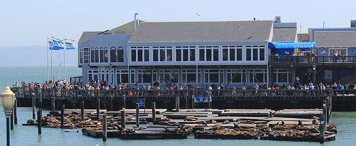 Shortly after the 1989 Loma Prieta Earthquake, sea lions began to appear at Pier 39, San Francisco's version of a middle-American mall/entertainment center. The Marine Mammal Protection Act allows these guys to go pretty much wherever they want, and they decided they liked the friendly confines of Pier 39's marina, so the marina management has acquiesced. On any given day you can find upwards of 100 boisterous sea lions basking on the docks that have been abandoned to them.