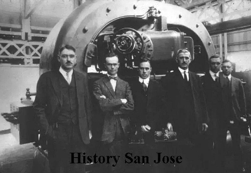 Federal Telegraph Company’s engineering staff, Palo Alto, ca. 1917. Behind them is the first of six 500 kilowatt arcs built for the US Navy (it would be installed at Pearl Harbor). On the table is the original 100 watt arc brought from Denmark. Left to right: Leonard F. Fuller, chief engineer; Harold Elliott, Corwin C. Chapman, Kurt Bley, Ralph R. Beal, Adrian L. Anderson.