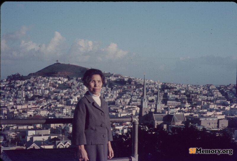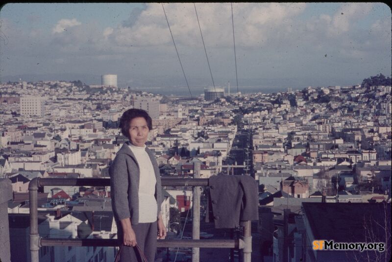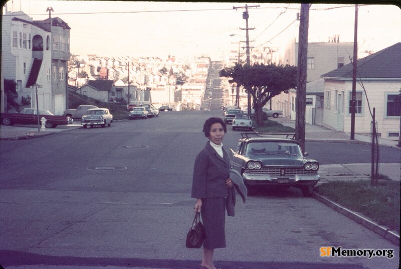 Mrs. Tabushi posing on Noe looking east at Duncan, 1970.