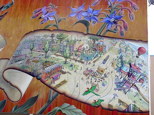 Mona Caron completed a double mural overlooking the Noe Valley Farmer's Market, in the Noe Valley Ministry Parking Lot every Saturday morning. Above is the callout with a look at historic Noe Valley, and following are a series of images of the two full size murals, and various details.