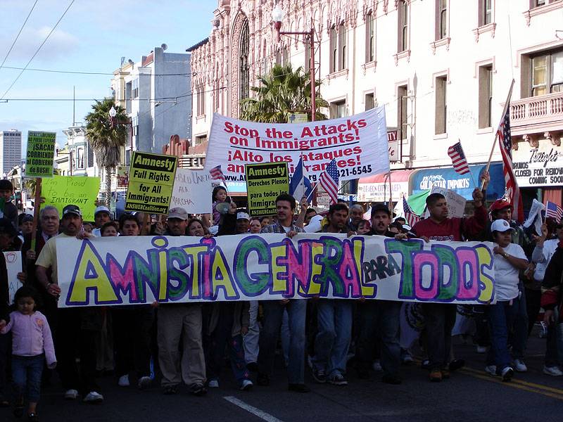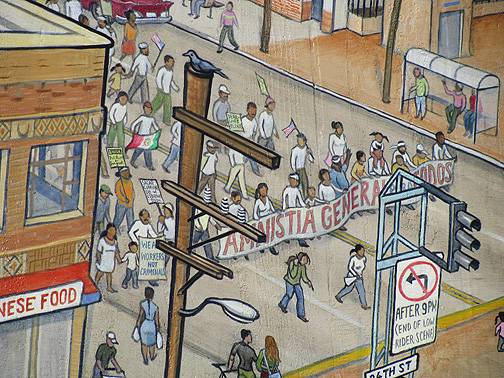 This last image captures the big MayDay Immigrant march held on April 10, 2006, which proceeded on Mission Street at 24th. As a mural gracing 24th Street, Caron extended her subject matter to the Mission District as well, only a few blocks to the east.