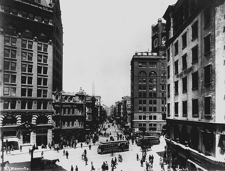 Northwesterly view at Geary/Kearny from Market, just three weeks before the big earthquake, March 31, 1906.