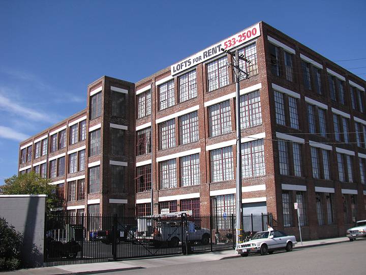The Jingletown Cotton Mill abuts the Nimitz Freeway (I-880) and has been converted to "artists lofts," 2015.
