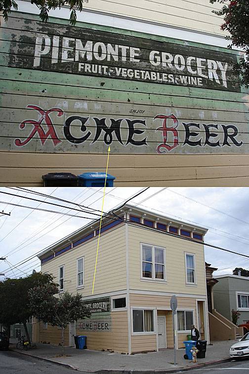As San Francisco undergoes endless gentrification and explosive growth of new office towers and business parks, occasionally the deconstruction process that removes old buildings reveals glimpses of fading signs of yesteryear. Here are a few snapshots taken during the early 21st century, ghosts of 20th century businesses long gone.