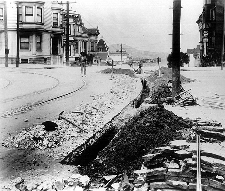 Ashbury and Frederick, 1928, streetcar infrastructure under construction.