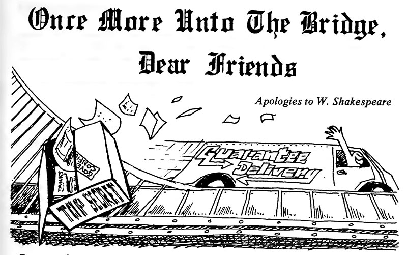 The 'on-the-job' protests could only do so much; they kept some pride but couldn't really change the facts of endless job, going nowhere, with too little money for all the problems. Late one night I passed a Pinto on the bridge—I didn't notice anybody in it but there was a woman nearby at the phone on the side of the bridge. A moment of driving and the rear-view mirror revealed a sheet of almost silken flames against the sky and a silhouette of a burning car that was careening past the Pinto. And then I was out of sight.