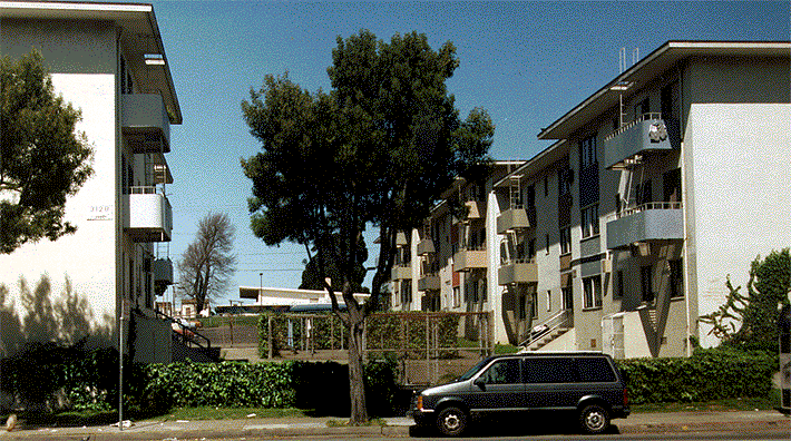 This project is considered a landmark for its technical breakthroughs in design. Critically, a "hierarchy of territorial control" is maintained by giving each household its very private space, clearly defined from the common inner court as well as from the street. No "undefensible spaces" are present, and clear visual separation of residents is obvious. By limiting escape routes, strategic overlooks, and access to off-the-street space, this housing joins the latest in security design with a reinforcement of middle class values. Whether it is real home ownership or "faux" home settlement, the design motive is ideological and evident. The rehab of the infamous Pink Palace into the Rosa Parks senior apartment complex is another example of this strategy. The once deteriorated, open-balconied "police puzzle" is now a fully enclosed model senior mini-city. The three pillars of defensive enclosure, visual separation and restricted access were also utilized in the recent redesign of 157 dwellings at the Sunnydale projects.