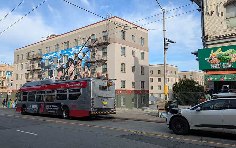 Ping Yuen, 2025, with a MUNI bus an a Waymo robo-car passing along Stockton Street.