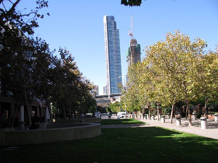 Looking north up the former 1st Street toward Rincon Hill, 1996. Delancy Street's new facility is the building to the right, and their name now graces this small street. The 76 Union tower just north of the Bay Bridge ramps has been given a new logo by one of SF's largest banks, after five decades of advertising Union Oil Co. of California. (It has since been replaced by new highrise constructon--C.C., 2008)