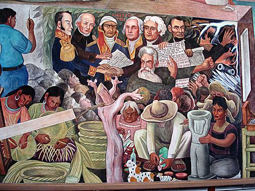 Two types of war balance each other. Rivera shows such figures from wars of revolution, which he admires, as Bolivar, Hidalgo, and Morelos, as well as Washington, Jefferson, Lincoln and John Brown. The balancing gaseous war cloud at right encompasses dictators Stalin (portrayed with blood-tipped pickax as the murderer of Trotsky), Hitler, and Mussolini to represent the onset of World War II, a war that in 1940 he perceives to be totalitarian aggrandizement.