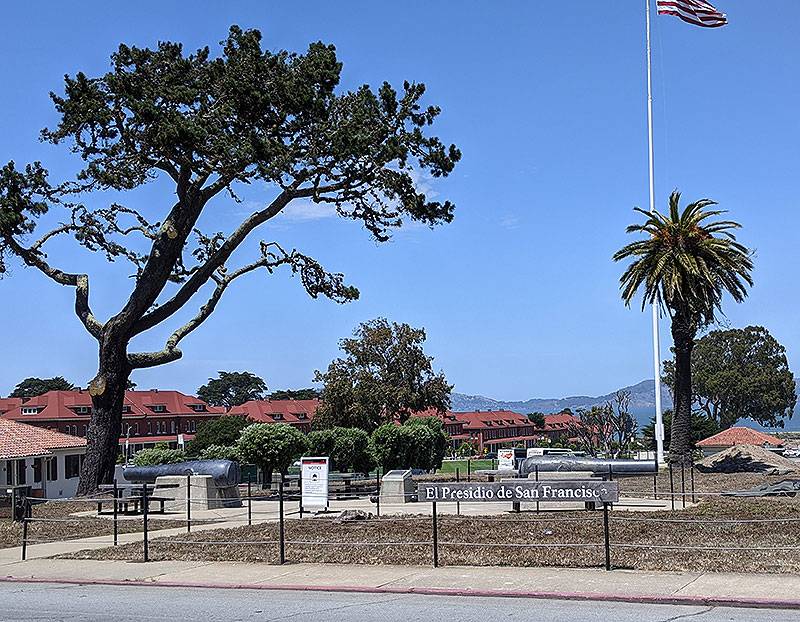 The Main Post of the Presidio, with an archaeological dig just beyond the sign and the cannon, 2021.
