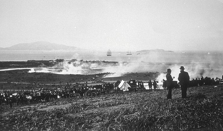 U.S. troops stage mock battle, c. 1876. Troops from the Presidio were used to subdue natives in northeastern California not long before this exercise.