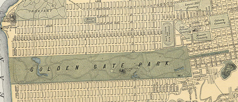 This 1890 real estate map shows the route of the Pacific and Ocean Railroad from Stanyan and Haight to the southeastern corner of the park, and then all along the future Lincoln Avenue to almost the beach before curving through the park to reach its terminus at the northwest corner of Golden Gate Park.