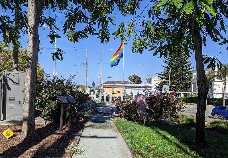 The pink decorative rocks arranged in a triangle at Pink Triangle Park, just west of the iconic intersection of Market and Castro.