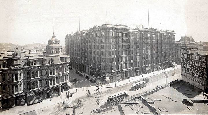 View northeast across the intersection of 4th and Townsend to Southern Pacific Railroad headquarters, 1870s.