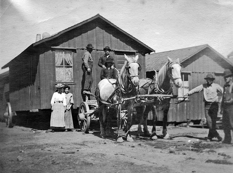 Residents in front of a temporary cottage being moved to a lot in the city.