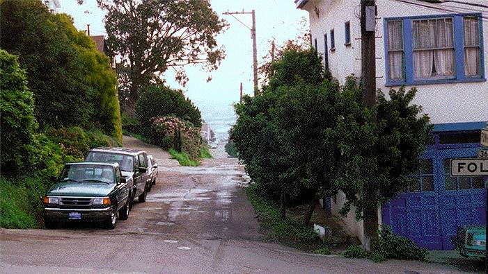 Powhattan Street, still not up to code in this January 1997 photo, skirts the southern edge of Bernal Heights Park, looking east from Folsom in this shot, showing it as a substandard lane, not a normal city street. It has since been widened and repaved, as shown in the photo below.