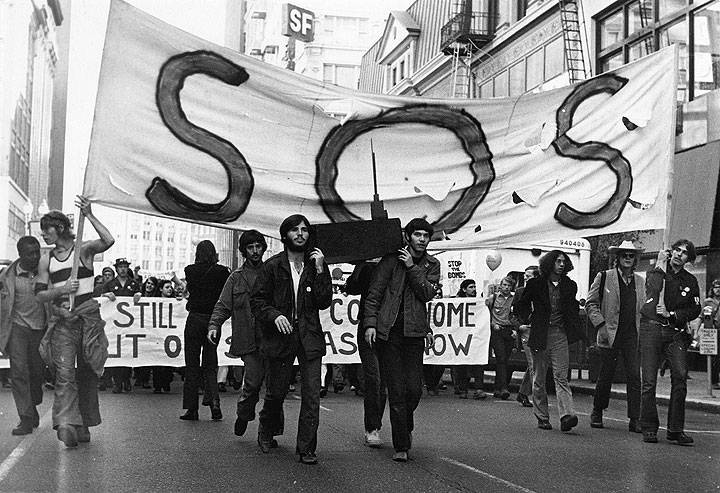 GIs and Vets lead anti-war march in San Francisco's financial district, 1973.