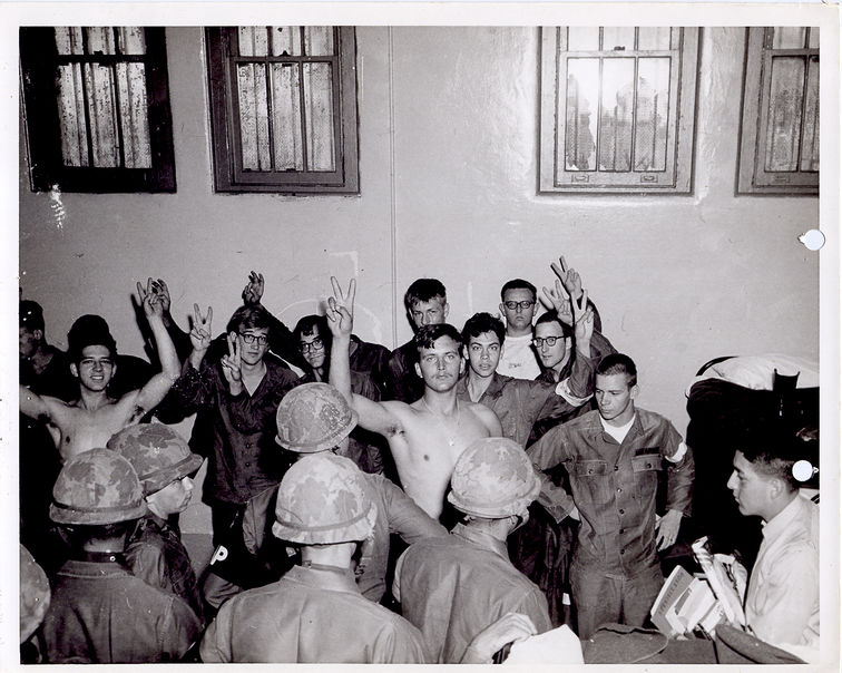 Meanwhile, inside the stockade, prisoners had been talking and decided to take coordinated action. That Monday following the shooting, 27 prisoners broke rank and sat with interlocked arms on a small lawn in the middle of the stockade. One of them stood up and read their demands, which included investigations into the murder of Bunch, the improvement of stockade conditions, an end to racist harassment of Black prisoners, and a statement of their opposition to the war in Vietnam. The commanding officer read aloud charges of mutiny, emphasizing that mutiny is a capital offense, but he was drowned out by the soldiers singing “We Shall Overcome.” Firemen were brought in to turn hoses on the sit-in, but they refused, so instead Military Police removed the soldiers one by one and brought them back to their cells.
